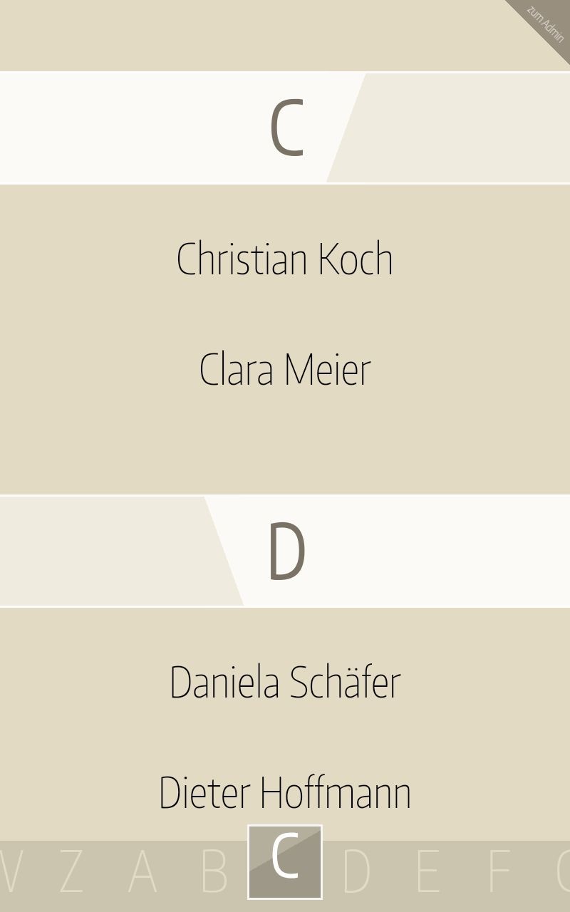 Startbildschirm beider Apps mit Namens-Slider – Gäste finden schnell ihren Namen und können zum Sitzplan oder Gästebuch.