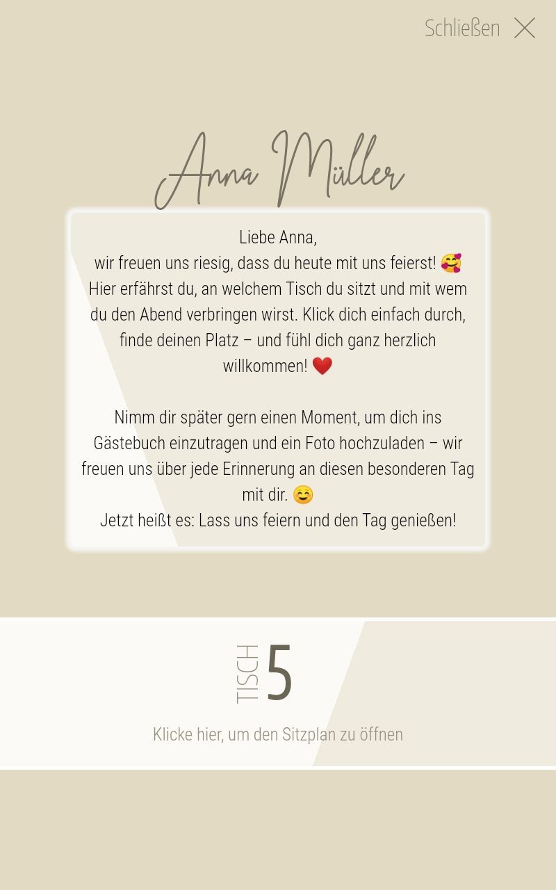 Jeder Gast wird mit einer persönlichen Nachricht und einem Foto vom Brautpaar begrüßt – inklusive Tischzuweisung.