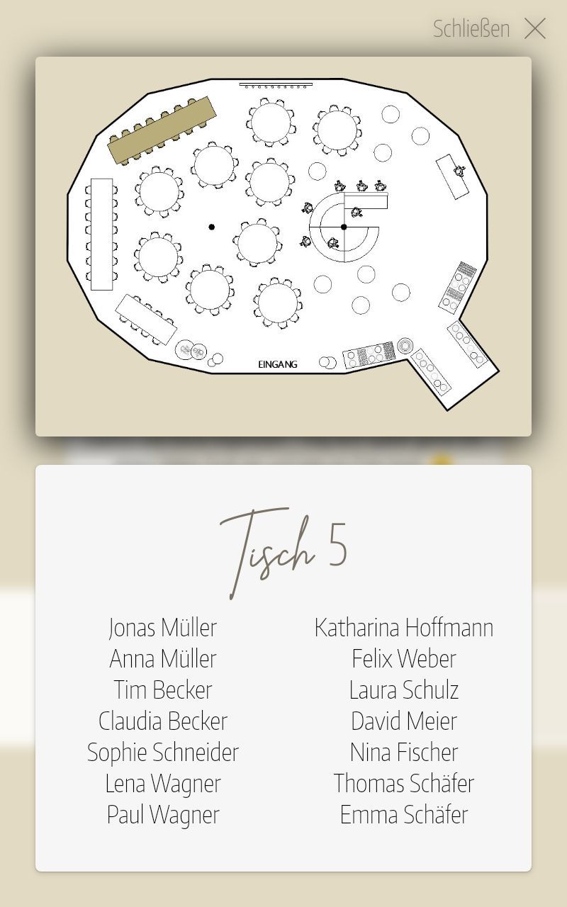 Gäste sehen eine visuelle Sitzordnung und wer mit ihnen am Tisch sitzt.